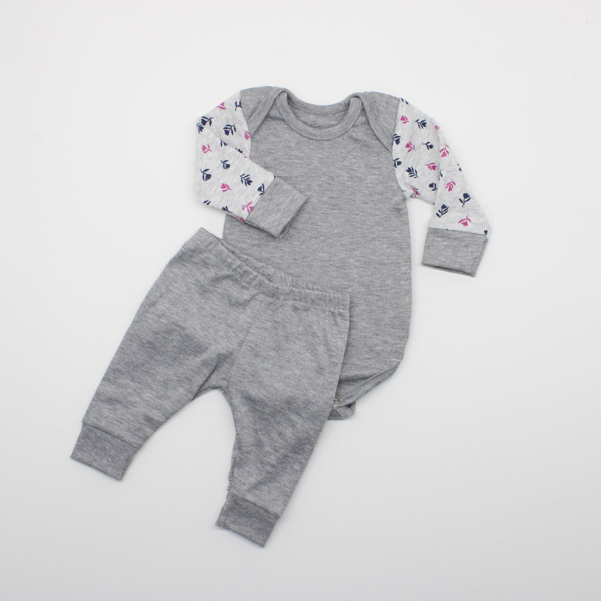 Conjunto Body Bebê Prematuro em Malha Ribana Cinza Mescla Mangas Florzinhas Com Calça em Malha Ribana Cinza Mescla Para Bebê de até 2,5 Quilos BOD146