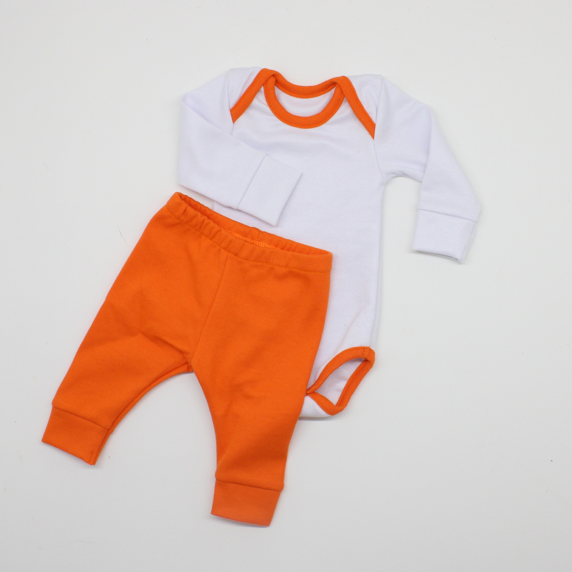 Conjunto Body Bebê Prematuro em Malha Ribana Branca com Laranja Com Calça em Malha Ribana Laranja Para Bebê de até 2,5 Quilos BOD208