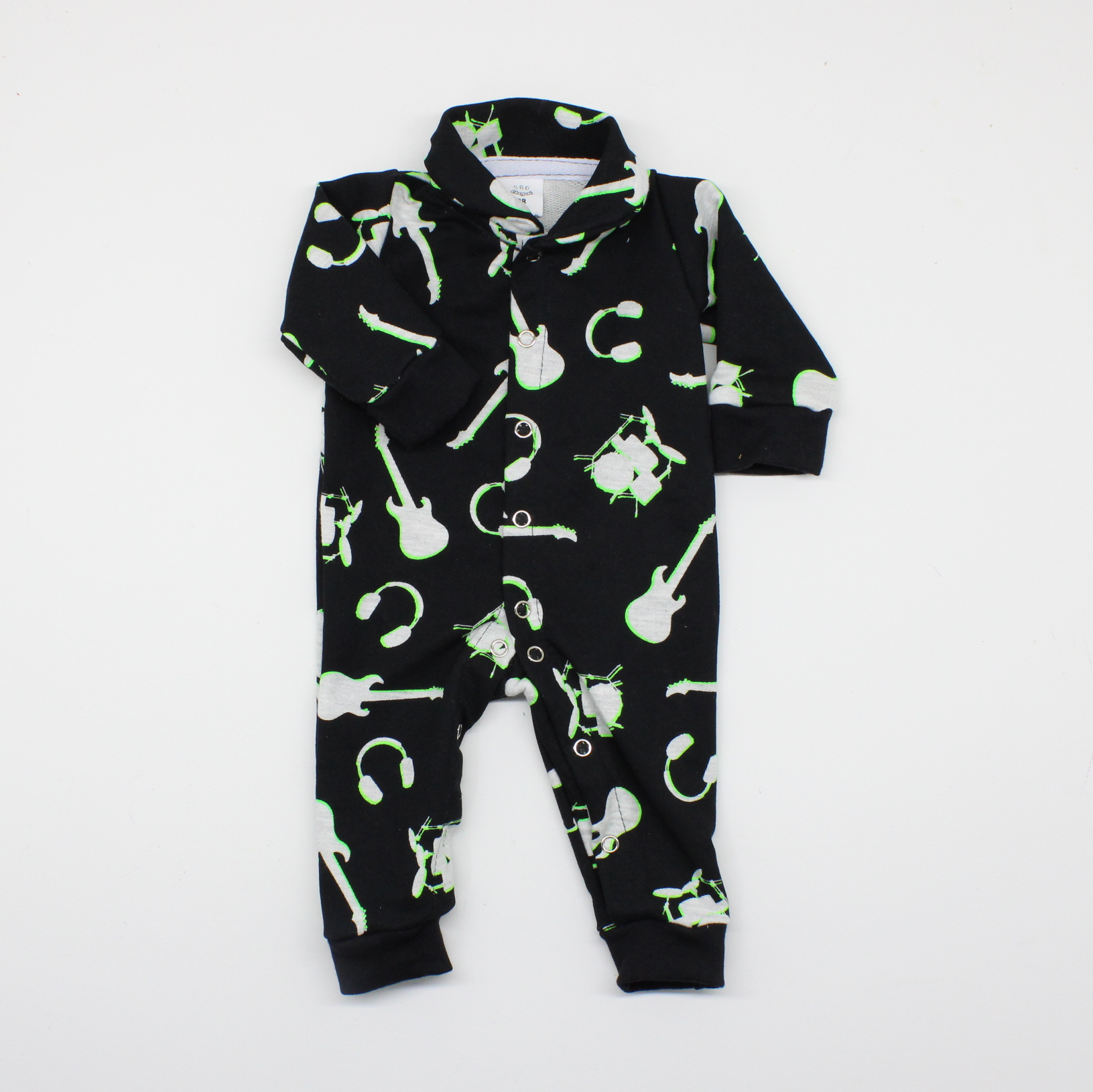 Macacão Tip Top Bebê Prematuro em Moletom Preto Guitarra Comprimento: 39cm do Ombro ao Calcanhar Largura: 40cm de Circunferência Mangas: 18cm de Comprimento Para Bebê de até 2,5 Quilos