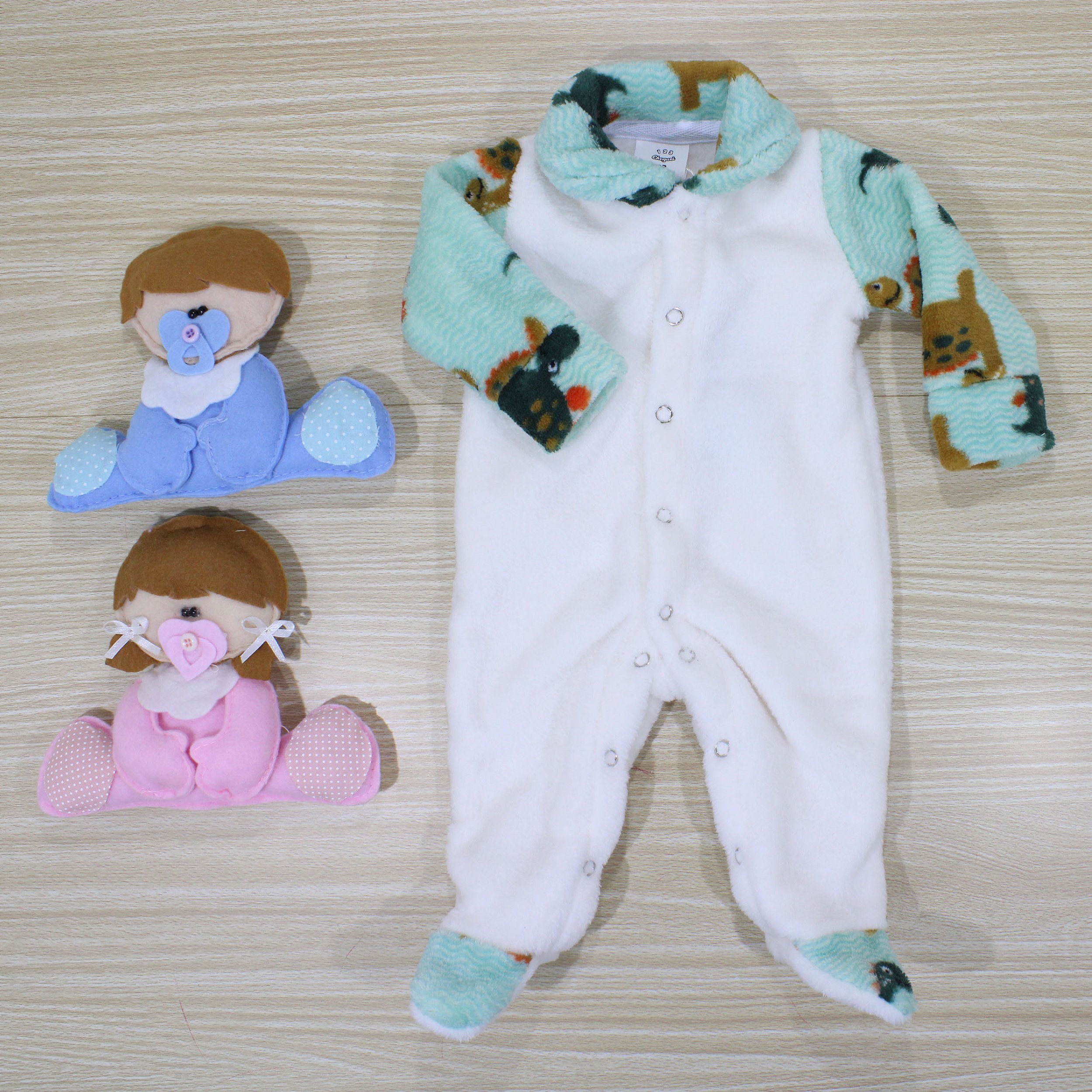 Macacão Tip Top Bebê Prematuro em Fleece Branco Gola e Mangas Dinossauro Comprimento: 39cm do Ombro ao Calcanhar Largura: 40cm de Circunferência Mangas: 18cm de Comprimento Ref: TIPFL062